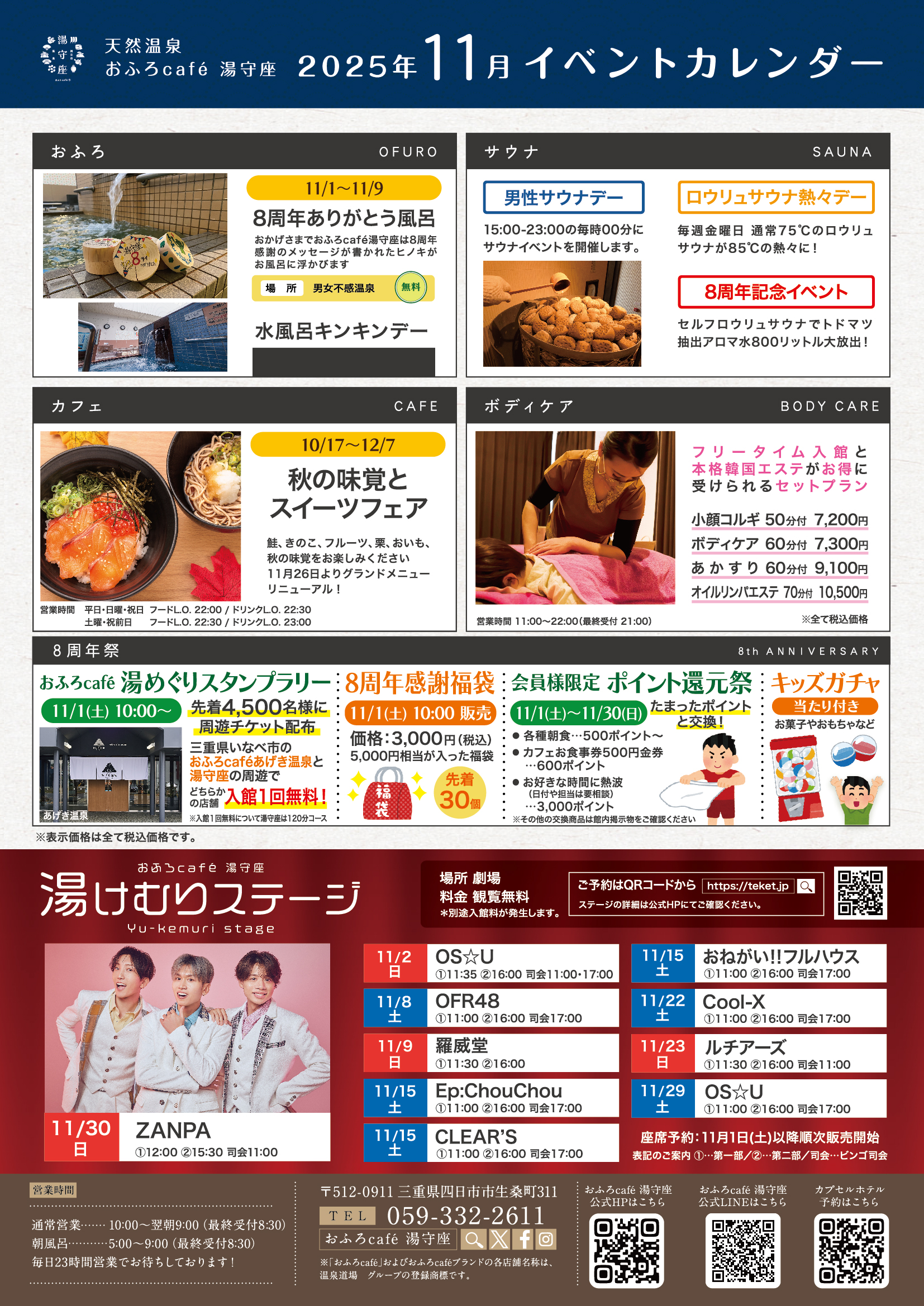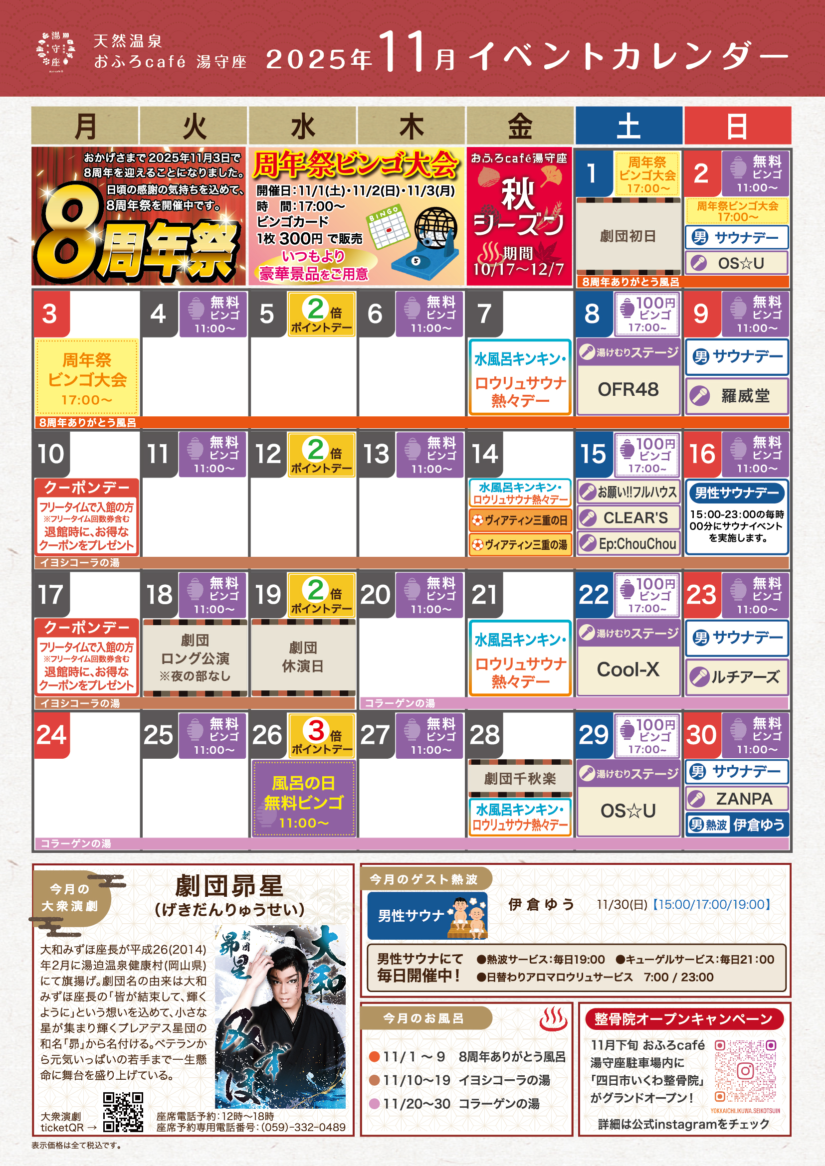 event2025.10.27 2025年11月イベントカレンダー 前の記事 一覧に戻る 次の記事 禁忌事項prohibited matter 下記該当する方の入館は固くお断りしております。他のお客様にご迷惑となると当施設が判断した場合には、退館していただくことがあります。館内でお見かけした場合には、即刻退館していただきます、その際の入館料の返金はできません。 泥酔状態の方 刺青・タトゥのある方、暴力団並びにその関係者とみなされる方 皮膚に疾患のある方、また他に伝染する疾患をお持ちの方 当施設への飲食物の持込