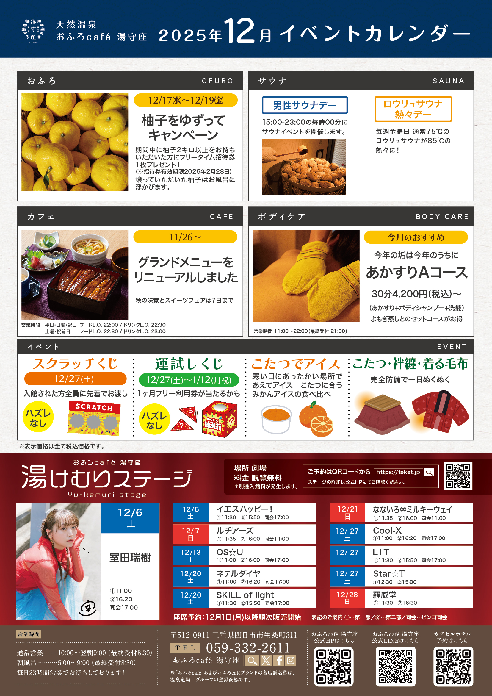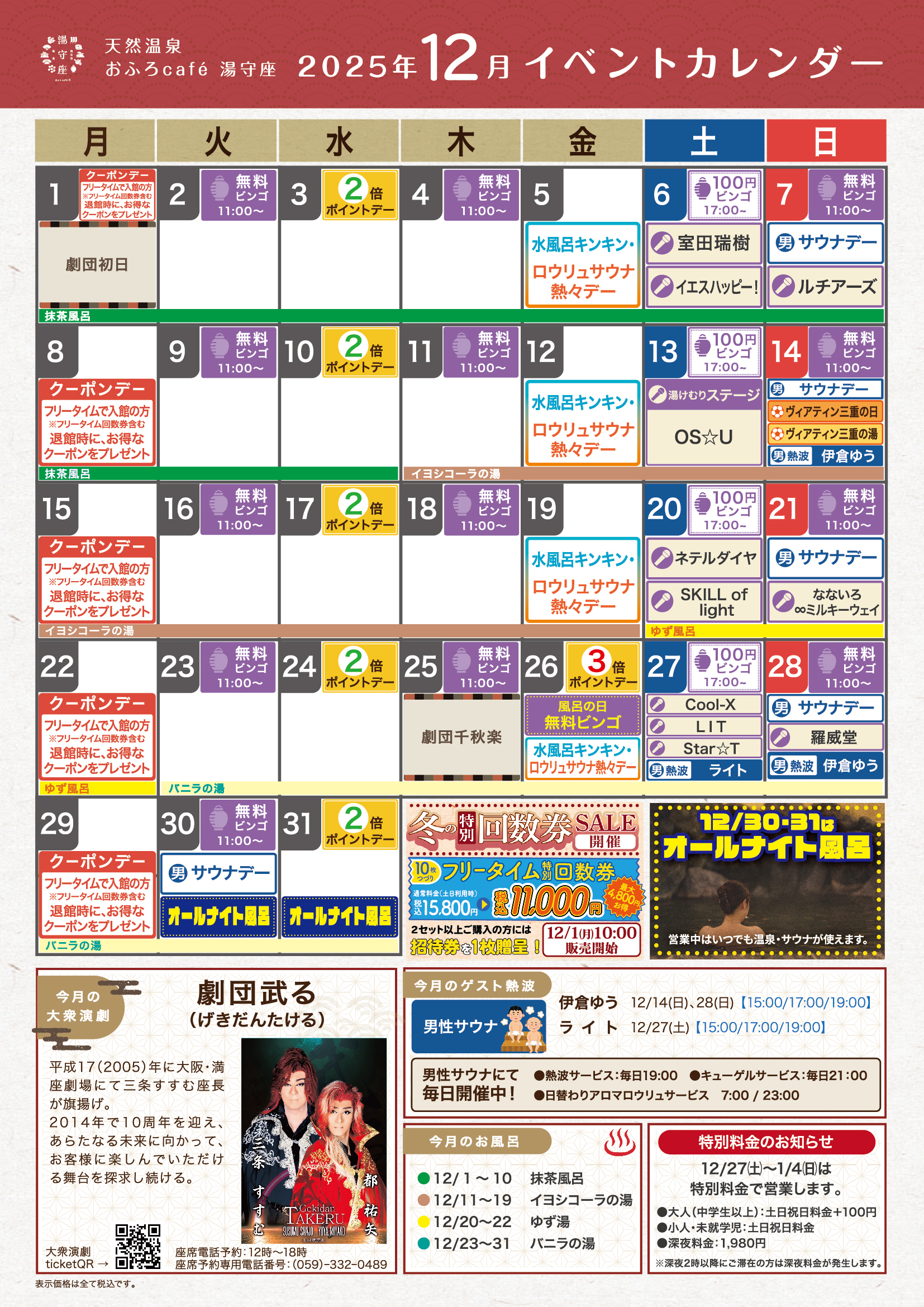 event2025.11.26 2025年12月イベントカレンダー 前の記事 一覧に戻る 次の記事 禁忌事項prohibited matter 下記該当する方の入館は固くお断りしております。他のお客様にご迷惑となると当施設が判断した場合には、退館していただくことがあります。館内でお見かけした場合には、即刻退館していただきます、その際の入館料の返金はできません。 泥酔状態の方 刺青・タトゥのある方、暴力団並びにその関係者とみなされる方 皮膚に疾患のある方、また他に伝染する疾患をお持ちの方 当施設への飲食物の持込