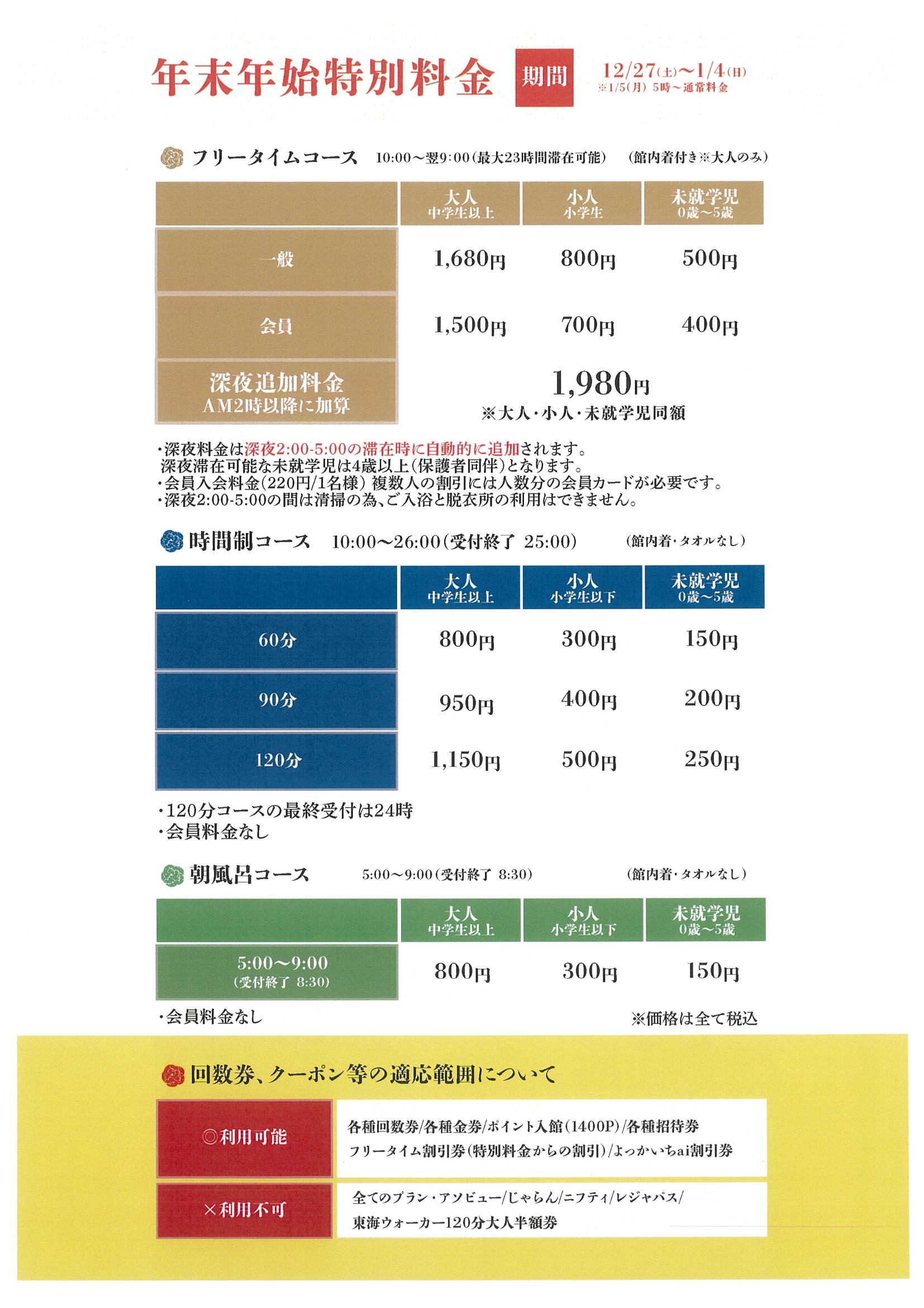 2025年12月27日(土)5:00より、2026年1月5日(月)5:00までは、下記特別料金にて営業させていただきます。