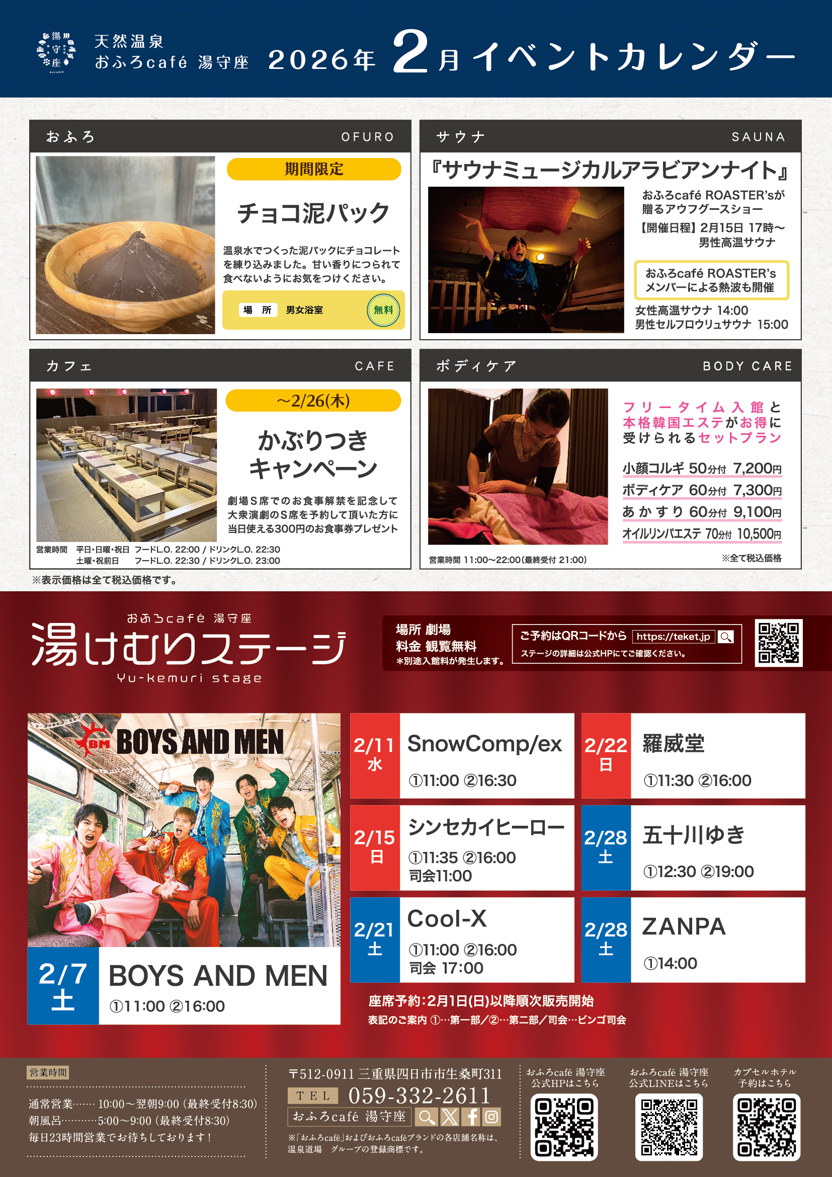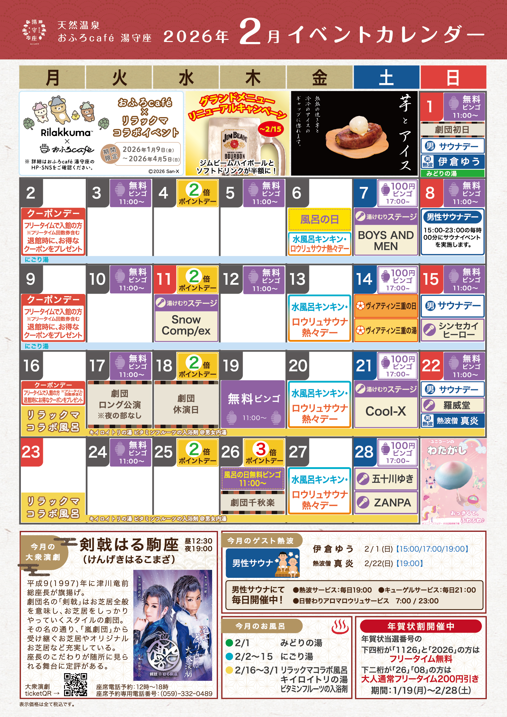 event2026.01.24 2026年2月イベントカレンダー 前の記事 一覧に戻る 次の記事 禁忌事項prohibited matter 下記該当する方の入館は固くお断りしております。他のお客様にご迷惑となると当施設が判断した場合には、退館していただくことがあります。館内でお見かけした場合には、即刻退館していただきます、その際の入館料の返金はできません。 泥酔状態の方 刺青・タトゥのある方、暴力団並びにその関係者とみなされる方 皮膚に疾患のある方、また他に伝染する疾患をお持ちの方 当施設への飲食物の持込